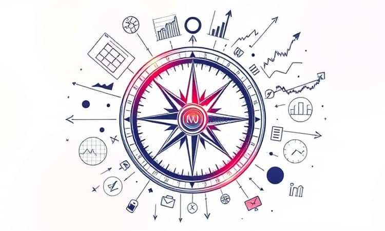 La metáfora de la brújula interna simboliza la fusión entre la intuición basada en datos y el análisis objetivo, creando un camino claro hacia el crecimiento sostenible.